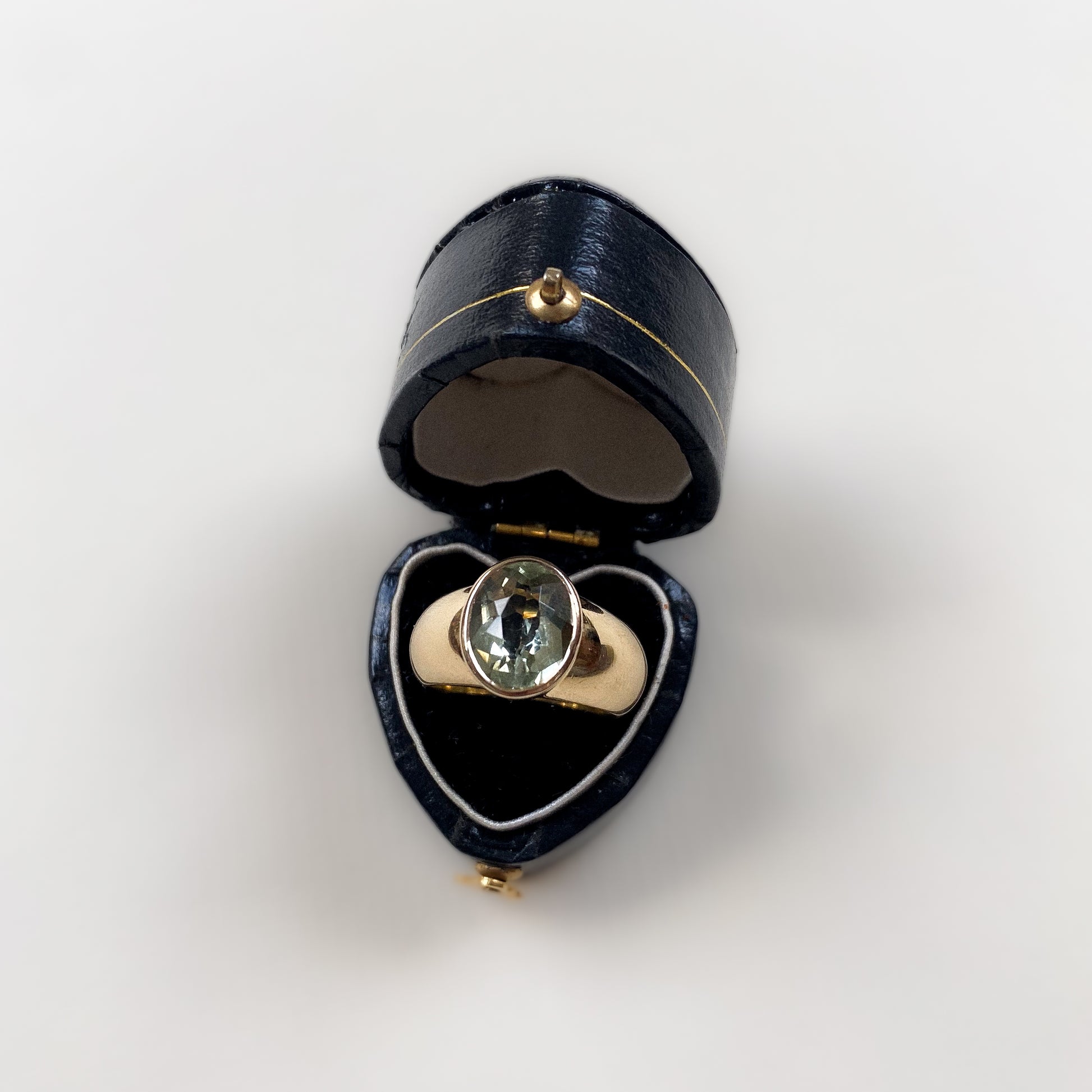 This vintage ring is crafted from solid 18-carat gold and features a bold, wide band. In the center is a beautiful tourmaline that really stands out. With its modern design, this ring is perfect for making a statement.