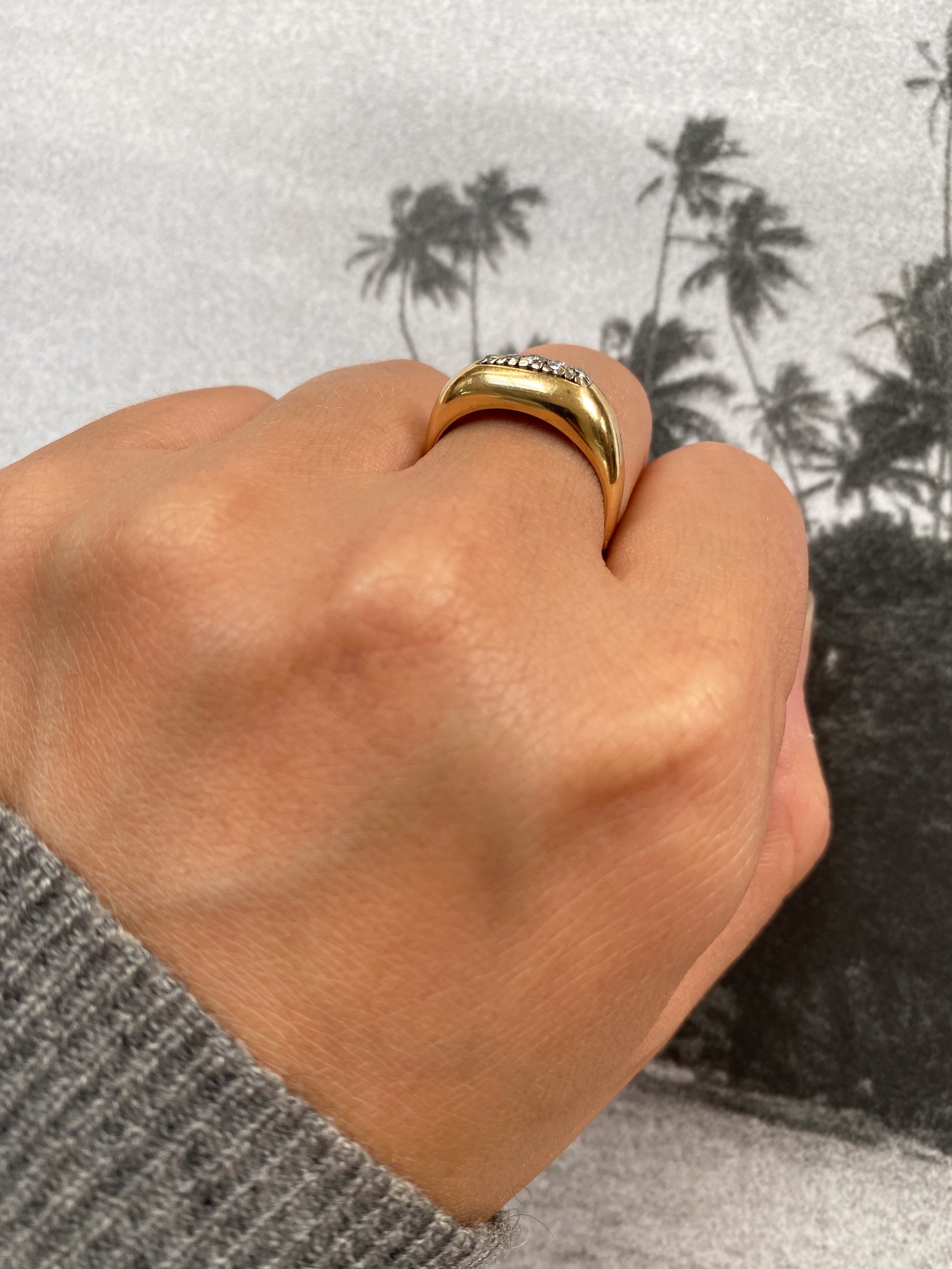 This modern dome ring is crafted from solid 18-carat gold and features a sleek, sculptural shape. A centered row of diamonds adds a bit of sparkle. This ring is bold, yet its the perfect everyday ring.
