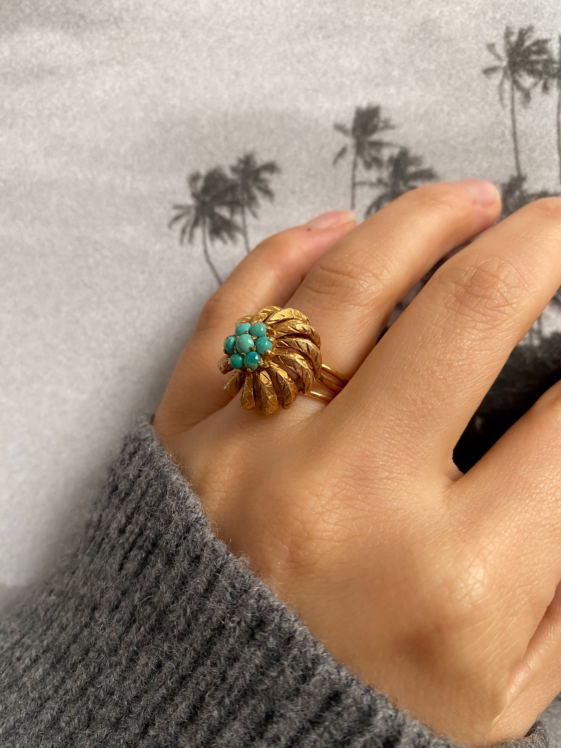 This vintage turquoise cluster ring is crafted from solid 18 carat gold and has refined details such as the palm leaves setting, perfect for a statement look.